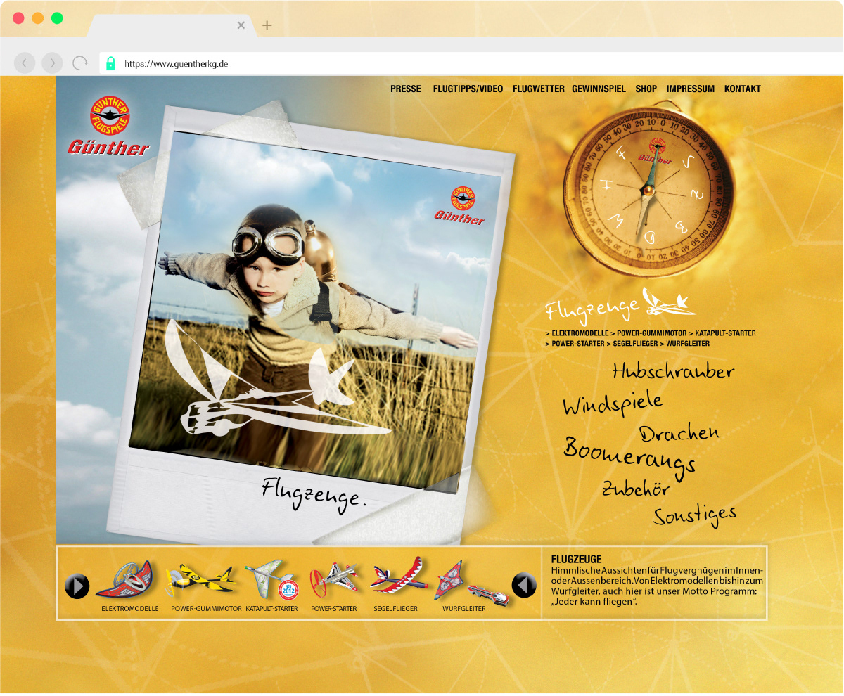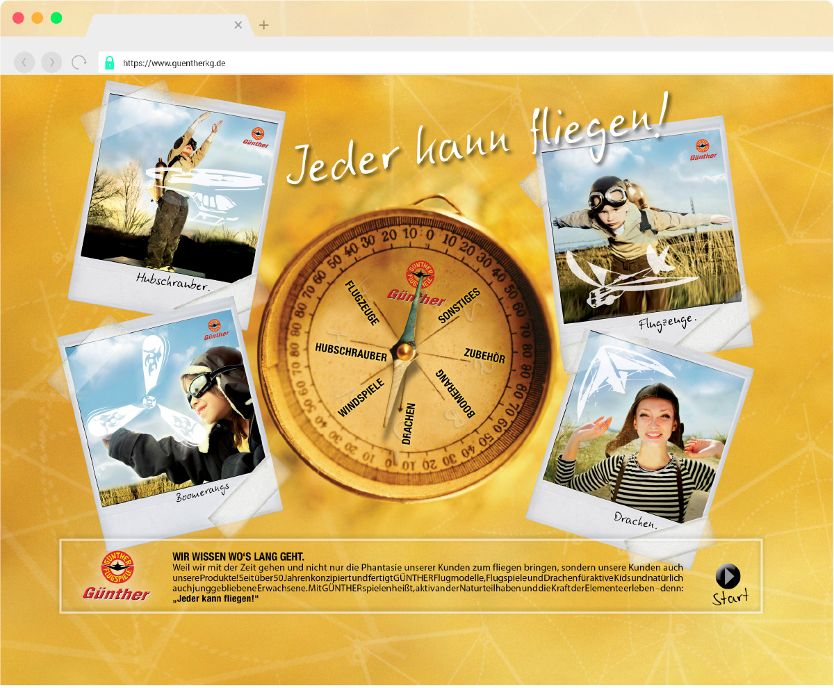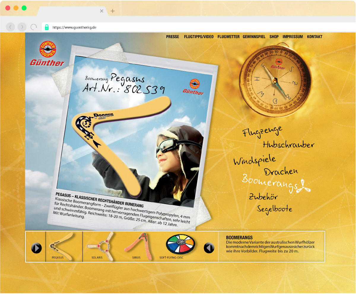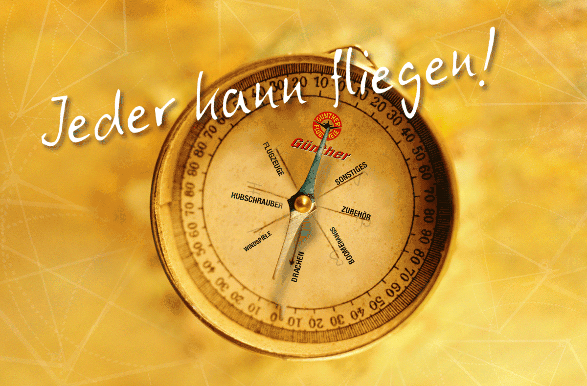 Als Navigation durch die Günther-Sortimentswelt dient der Produktkompass. Wenn eine Themenwelt einzeln erscheint, richtet sich die Kompassnadel entsprechend aus.