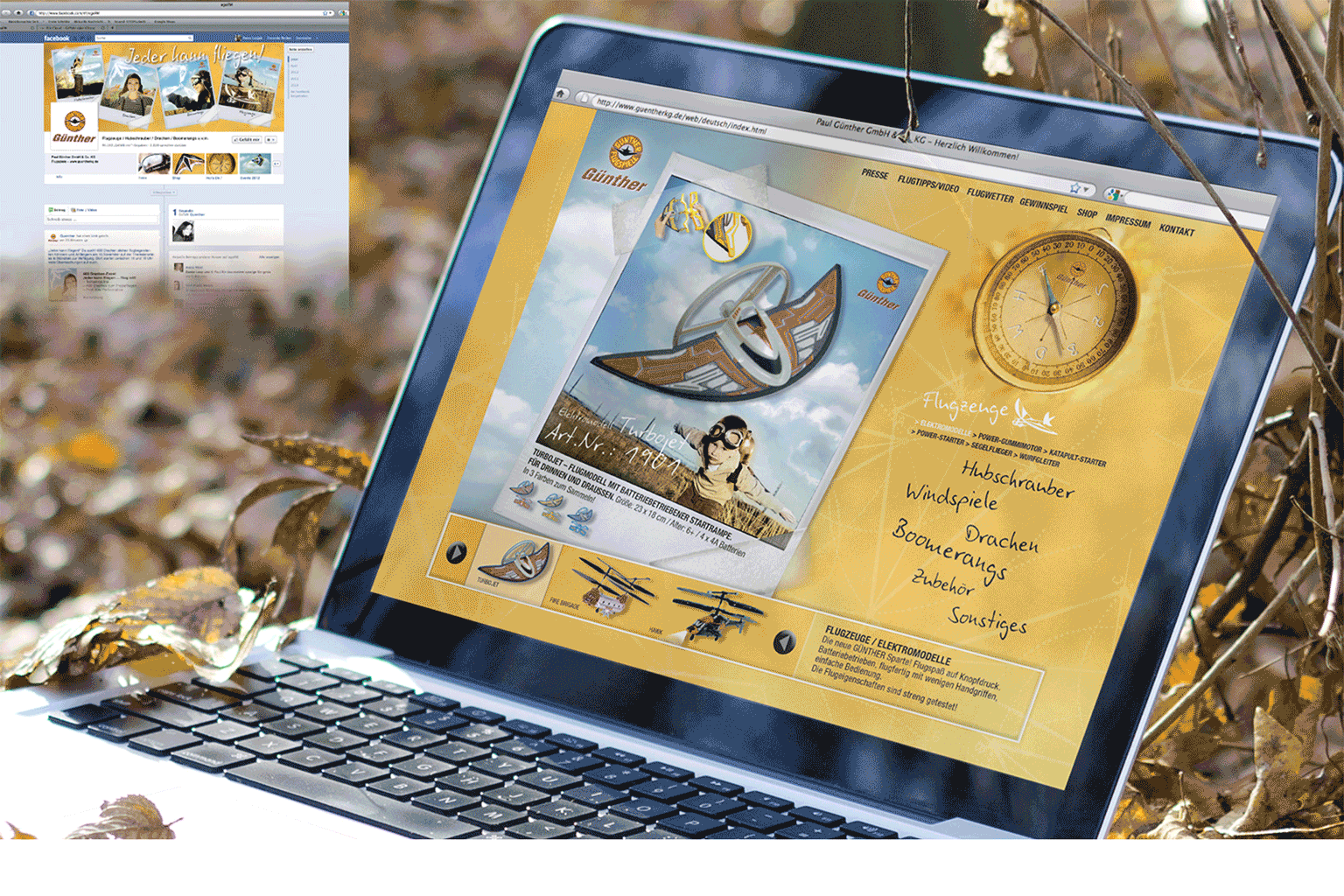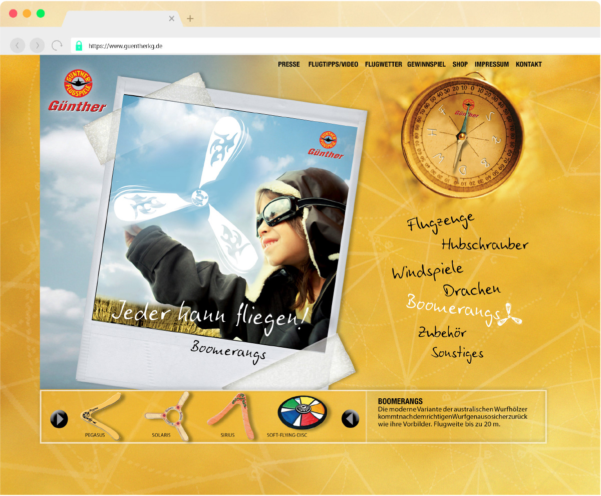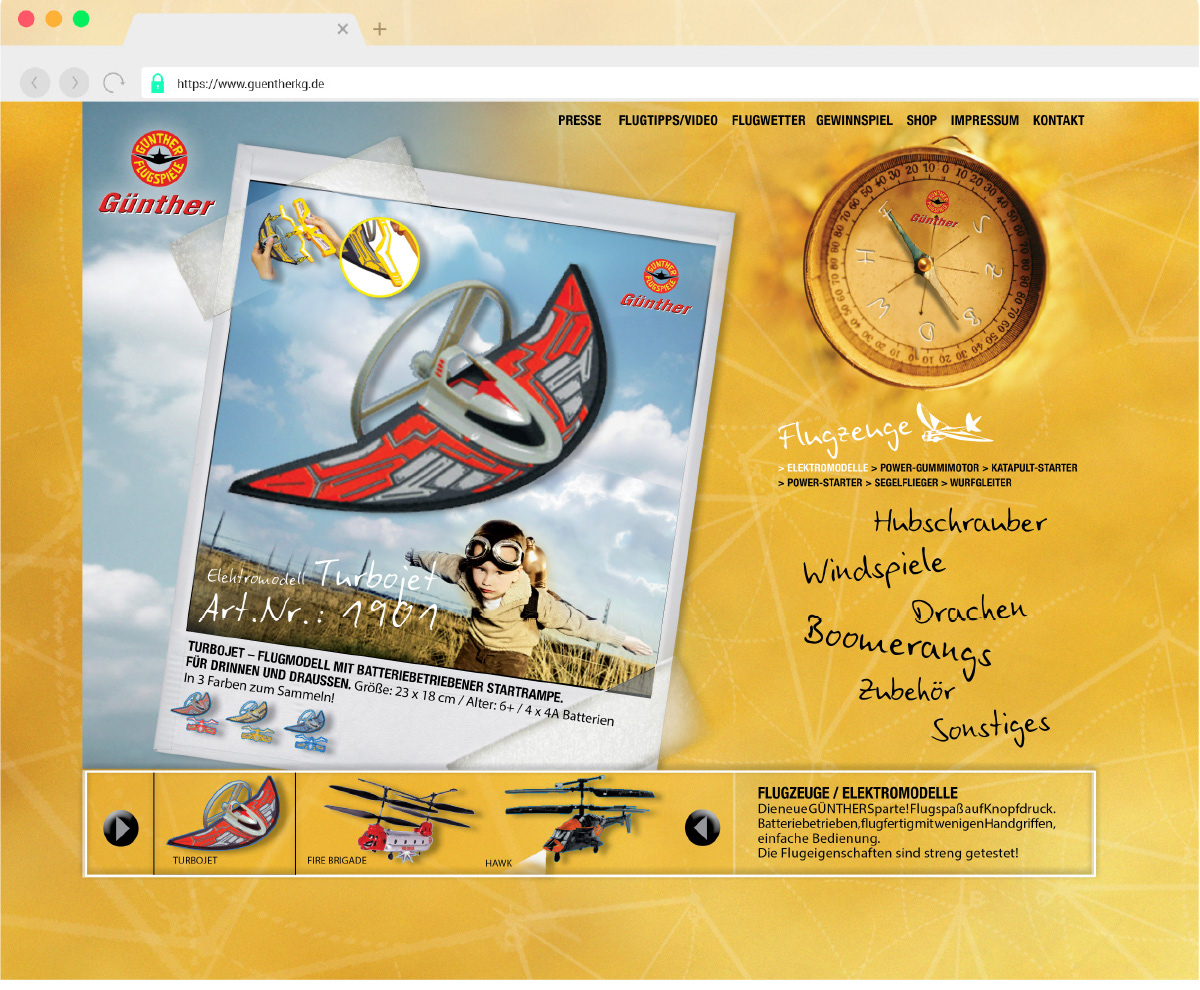 Als Navigation durch die Günther-Sortimentswelt dient der Produktkompass. Wenn eine Themenwelt einzeln erscheint, richtet sich die Kompassnadel entsprechend aus.